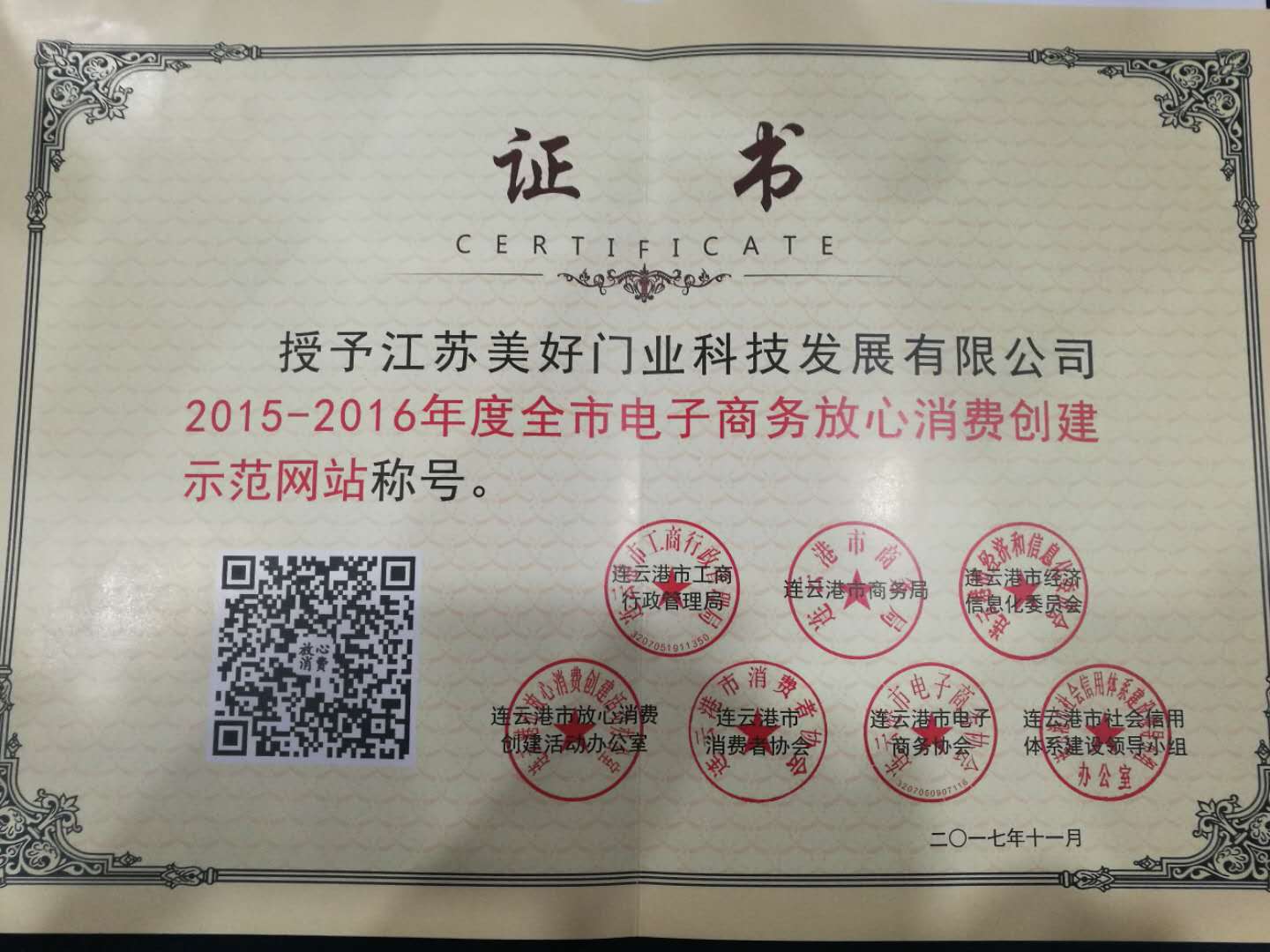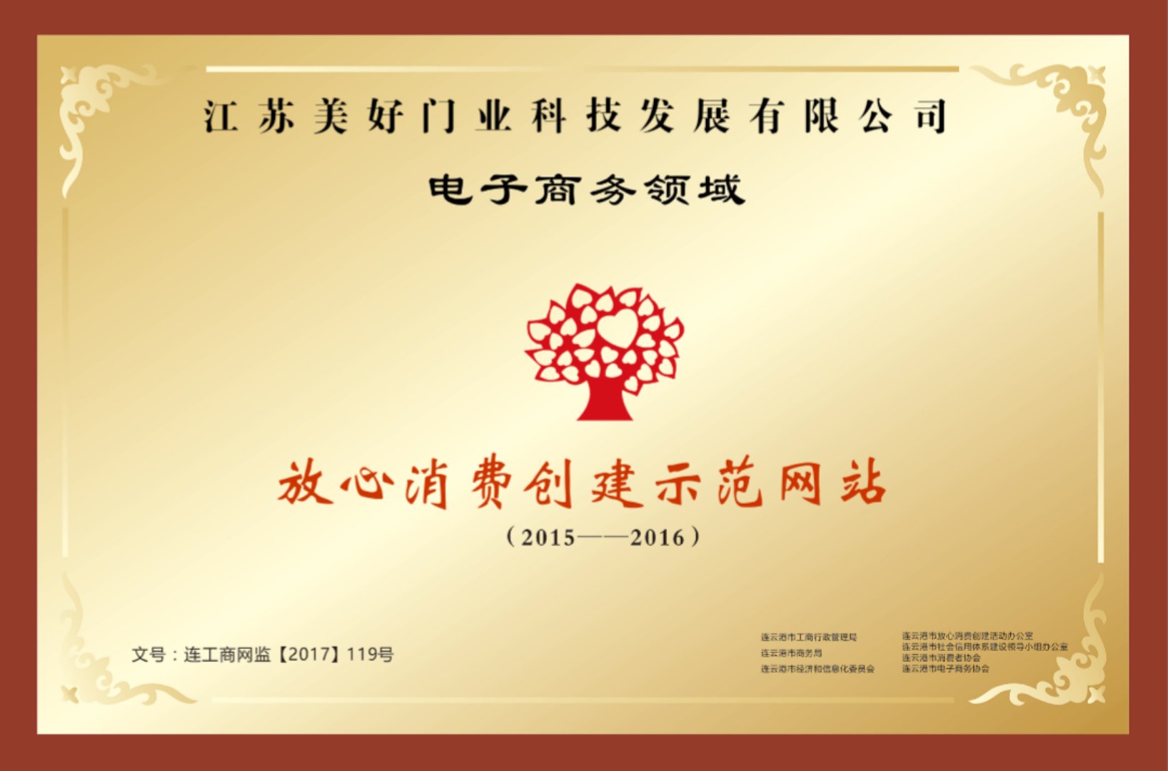 江蘇美好門業(yè)科技發(fā)展有限公司榮獲“全市電子商務(wù)放心消費(fèi)創(chuàng)建示范網(wǎng)站”