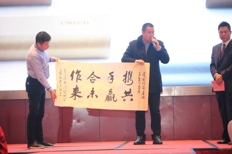連云港市門窗協會會長潘國柱向本屆交流會的主辦方敬獻一幅書法作品,并發表“攜手合作,共贏未來”的主題演講。